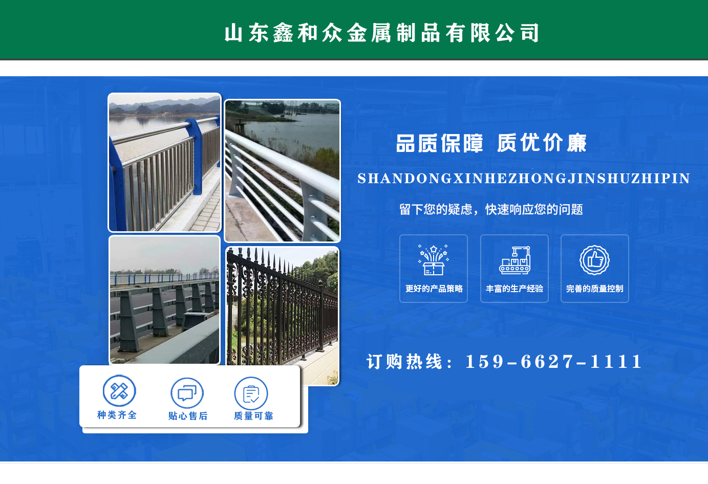 山东鑫和众金属制品有限公司主要产品有防撞护栏,桥梁护栏,道路护栏,河道护栏,不锈钢护栏等护栏。提供设计方案,一站式定制,包您满意价格优惠,欢迎来电咨询! 公司常年从事销售护栏防撞护栏,桥梁护栏,道路护栏,河道护栏,不锈钢护栏,桥梁钢护栏,河道灯光护栏等。产品广泛应用于桥梁、河道、旅游景区、道路、公路、公园、小区、景观、道路防撞等领域?! 」静肪捎糜胖什恍飧植牧希舷喙乇曜?。各种型号不锈钢复合管及护栏,质量严格把控。产品强度高、耐腐蚀、焊接牢固、抗冲击、性能好,防撞护栏结构简单、美观实用大方?! 』队袄炊┕?!...